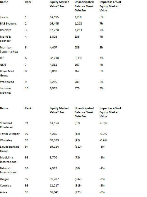 The FTSE 100 companies most positively affected by their pension schemes were:
