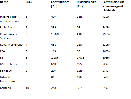 The following companies had the highest levels of pension scheme contributions relative to their dividends declared in a year. This may suggest that these companies are prioritising the financial health of their pension schemes over making returns to shareholders.