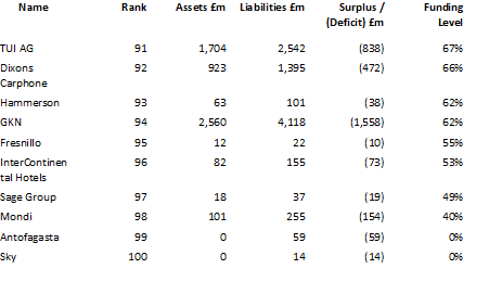 The FTSE 100 companies with the worst funded pension schemes overall were as follows: