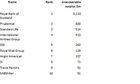 The FTSE 100 companies who have made the largest surplus contributions to their pension schemes were as follows: