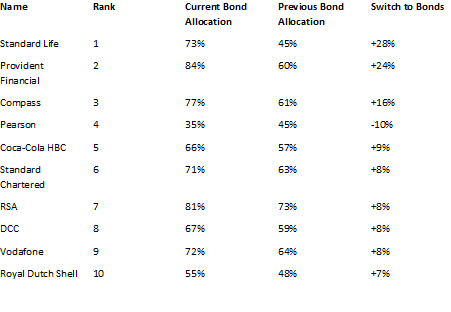 - There are a number of companies reporting very significant individual changes to investment strategies. Three FTSE 100 companies changed their bond allocations by more than 10%.