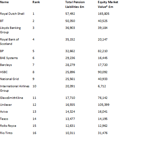 The FTSE 100 companies with the largest pension scheme liabilities (all those over £10 billion) are as follows: