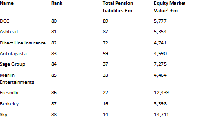 In addition, Admiral, ARM Holdings, Burberry, Easyjet, Hargreaves Lansdown, Hikma Pharmaceuticals, Intu Properties, Paddy Power Betfair, Randgold Resources, Shire, St. James’s Place and Worldpay Group all reported no defined benefit pension liabilities.