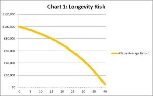 Taking the example and plotting the outcome, over time, the £100,000 will be eroded by the withdrawals and the fund will run out shortly after the 40th anniversary.