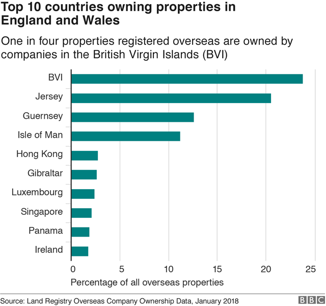 Of the properties owned by overseas companies in England and Wales, two thirds are registered to firms in the British Virgin Islands, Jersey, Guernsey and the Isle of Man.