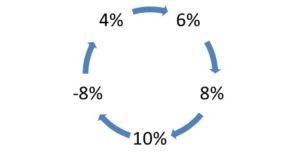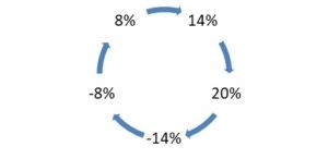 The average over this five year period is 4% per year. We can generate five sequences of return (1) 4%, 6%, 8%, 10%, -8% (2) 6%, 8%, 10%, -8%, 4% (3)…… and so on. Just choose a starting point for the sequence and then follow the numbers clockwise. To create a sequence that’s longer than 5 years, just keep going clockwise around the circle (repeating the five year cycle).