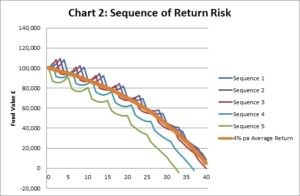 This shows that the sequences have different outcomes. Two of the sequences result in more money remaining after 40 years than the average 4% pa return scenario used for longevity risk. Three sequences result in money running out sooner. The worst case scenario is the fund runs out after 33 years. This demonstrates the sequence of returns risk.