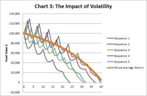 This shows that volatility has a detrimental effect. All the sequences result in money running out sooner than the 4% pa average return. The worst case scenario is the fund runs out after 23 years. This demonstrates volatility risk.