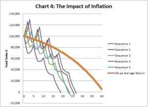 To demonstrate inflation risk we just need to take the example in 3 above and increase the rate of withdrawal by inflation. We do this to maintain the purchasing power of the withdrawals.